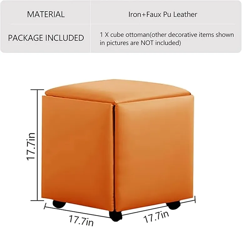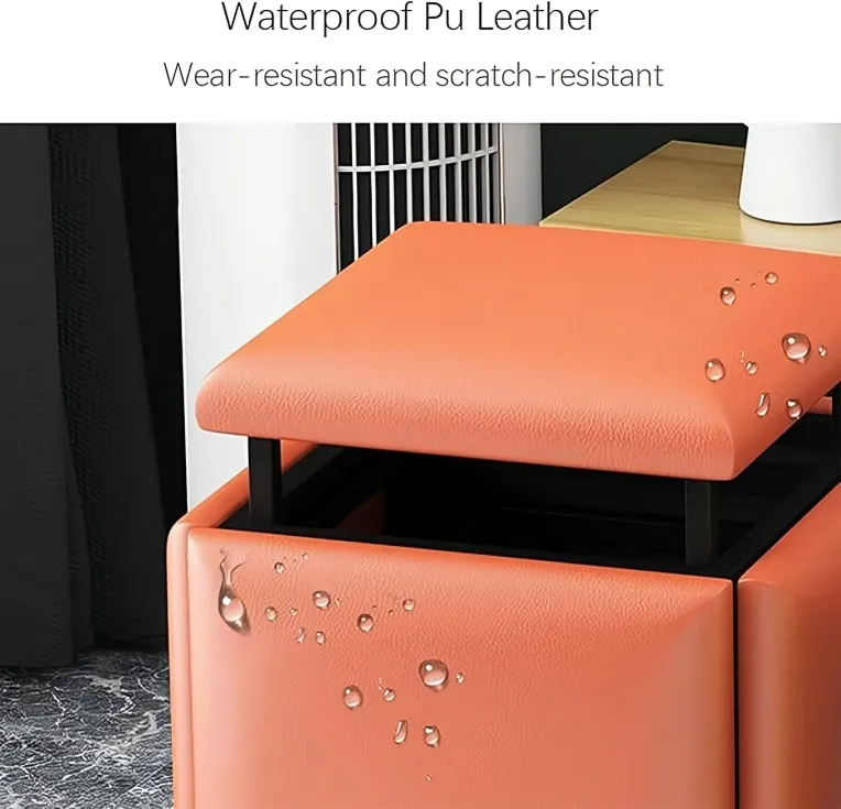 المواد: مصنوع من فولاذ كربوني متين، نسيج تكنولوجي، جلد أو قماش عالي الجودة، إسفنج عالي الكثافة، مع عملية طلاء مقاومة للصدأ والرطوبة والتآكل.التصميم: 5 في 1 على شكل مكعب نرد، يمكن استخدامه كمقعد واحد أو تقسيمه إلى 5 مقاعد منفصلة.الاستخدامات: يصلح كمقعد، طاولة قهوة، طاولة جانبية، أو وحدة تخزين للديكور.المزايا: سعة تحمل حتى 200 كجمسهل التجميع بفضل العجلات ووسائد القدميوفر المساحة عند التخزينيمكن نقله وإعادة ترتيبه بسهولةالمكان المناسب: غرفة المعيشة، غرفة النوم، المكتب، غرفة الطعام، الشقق الصغيرة.