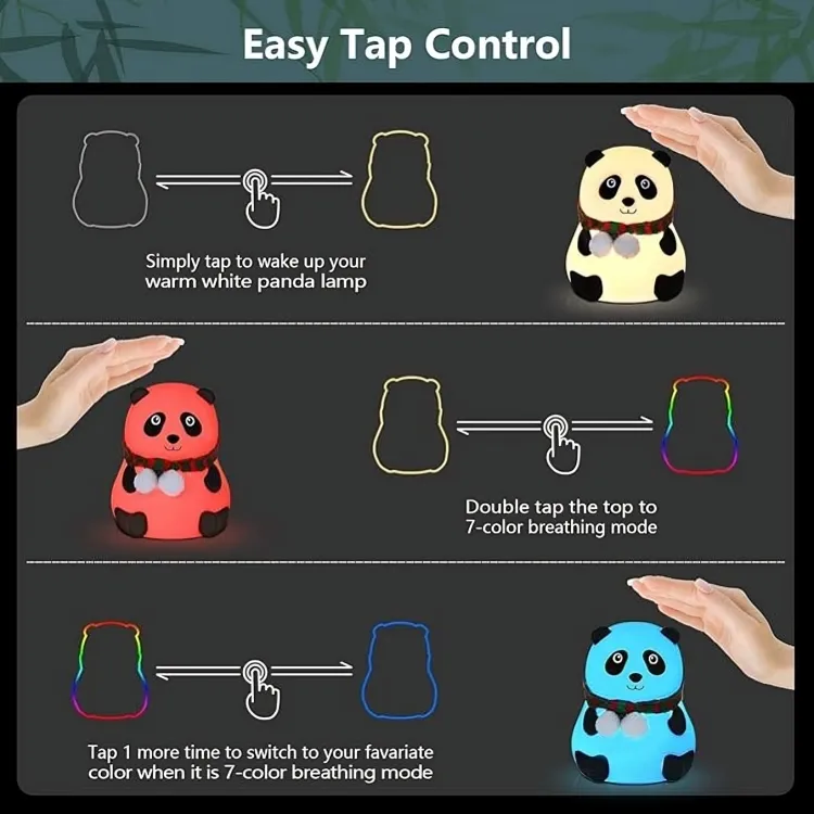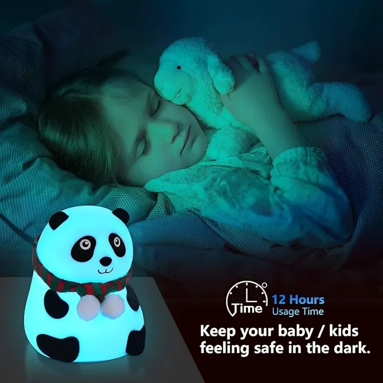 تصميم لطيف وجذاب على شكل باندا يضيف لمسة جمالية لغرفة الطفل.يحتوي على 7 ألوان نابضة بالحياة مع إمكانية تغيير الألوان لخلق جو مريح وسحري.مصنوع من السيليكون الناعم، آمن تمامًا للأطفال ولطيف عند اللمس.يعمل ببطارية قابلة لإعادة الشحن، مما يجعله عمليًا وسهل الاستخدام.يتم التحكم فيه باللمس لتغيير الألوان بسهولة.مثالي كضوء ليلي وديكور لغرف نوم الأطفال.
