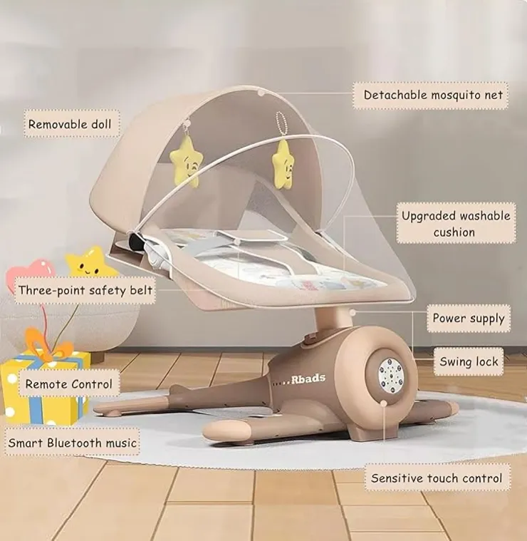 مظهر فريد: تصميم القاعدة على شكل طائرة يمنح الأرجوحة مظهرًا جذابًا ومميزًا مع ثبات ومتانة عالية.تحكم ذكي: تعمل عبر شاشة لمس وجهاز تحكم عن بعد، مع إمكانية تشغيل الموسيقى من خلال البلوتوث.خيارات متعددة للتأرجح: توفر 4 درجات للتأرجح (10°، 16°، 20°، 25°) تناسب راحة الطفل.وظائف توقيت مرنة: تتضمن 4 خيارات توقيت (10، 20، 30، 40 دقيقة) لتناسب احتياجاتك اليومية.مسند ظهر قابل للتعديل: يمكن ضبطه بثلاث زوايا مختلفة لضمان راحة الطفل أثناء الجلوس أو الاستلقاء.سهولة في التجميع: خفيفة الوزن (5 كجم)، سهلة التركيب والتفكيك لتناسب الاستخدام المنزلي أو أثناء السفر.دعم البلوتوث: يمكن توصيل الهاتف لتشغيل موسيقى الطفل المفضلة، مع ألعاب قابلة للإزالة للترفيه الإضافي.راحة ونظافة: وسادة مصنوعة من ألياف بوليستر ناعمة، قابلة للتعديل والغسل، مع شبكة ناموسية قابلة للإزالة تحمي الطفل من الحشرات وتسمح له برؤية محيطه.
